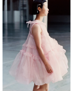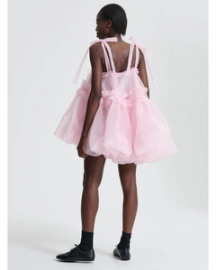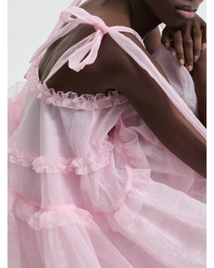 L’abito Cristina, proposto nella delicata nuance rosa cipria, rappresenta una sintesi perfetta di leggerezza e struttura, cifra stilistica inconfondibile della maison Cecilie Bahnsen. Realizzato nell’innovativo tessuto Liquid Myrtia, dalla texture fluida e leggermente lucente, il capo si distingue per le sue proporzioni scultoree e al contempo eteree. Le arricciature morbide e i fiocchi decorativi applicati sulle spalle conferiscono movimento e un tocco sognante, mentre l’ampiezza nella costruzione del punto vita crea un volume arioso che accompagna il corpo con grazia.