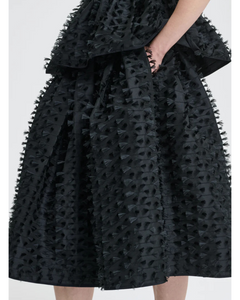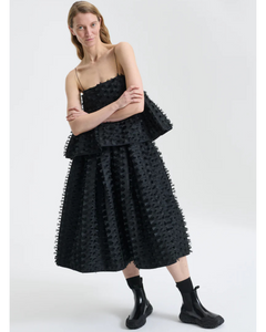 La gonna unisce volumi architettonici a un’eleganza couture, esprimendo la visione contemporanea della femminilità firmata Cecilie Bahnsen. Realizzata nell’esclusivo tessuto fil coupé effetto fiamma, presenta una silhouette ampia e strutturata che scende con leggerezza fino a metà gamba. La vita è rifinita con un elastico coulisse, comodo e regolabile, mentre le tasche laterali aggiungono un tocco funzionale ideale per l’uso quotidiano.